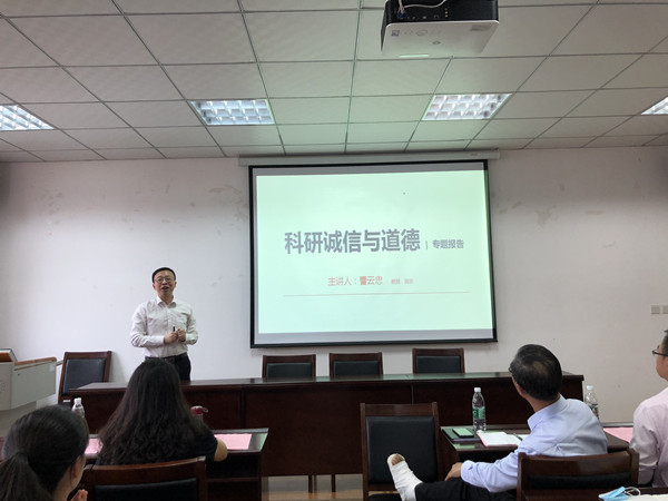 学院院长曹云忠做了《科研诚信与道德》专题报告,指出作为学术研究人应该秉持科学、严谨、诚信态度,通过举出实际案例,系统阐述了如何避免数据处理、论文撰写、文献引用、论文发表以及学术履历等方面的诚信问题。