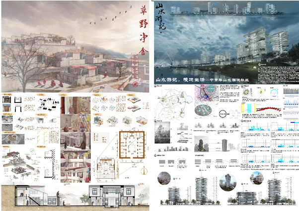 两支参赛队伍在指导教师的带领下,积极进行实地调研、数据采集处理、设计方案推敲、软件模拟处理等,团队上下通力协作,开展头脑风暴,为绿色建筑发展提供新思路。朱曦同学团队作品《“草野净舍”——拉卜楞扎西寺僧舍建筑改造》提出高效、典型且低碳排的改造方案,对室内热环境进行优化改造的同时使太阳能得以充分利用,打造甘南农村僧舍建筑低碳节能型改造方案,为节能-舒适-经济型建筑设计提供思路与参考;杨荣涛同学团队作品《山水游记,慢进生活—让建筑成为环境的延续,中青年山水潮流社区》,将传统文化的精神和游玩山水的乐趣与绿色建筑技术的结合,以此来构建环境舒适的中青年漫游社区。