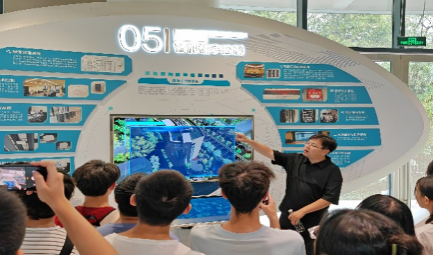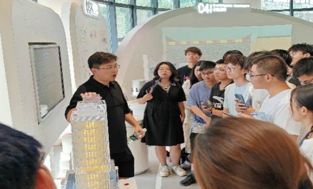 随后访学团来到建科院绿色三星建筑示范项目展厅,探秘西南首个“绿色三星”建筑。始建于1985年的四川省建科院大楼,于2015年本着“节约资源、低成本、低能耗、精细化”的设计理念,因地制宜地采取BIM技术、被动式建筑节能设计、垂直+屋顶绿化、空气质量在线监测、雨水回收利用、太阳能光伏发电技术、智能灯光+空调控制系统、新风热回收系统、集成智能化系统、外窗外遮阳技术等十余项绿色节能改造,获得了西南地区国内首个“绿色三星”认证,这是国内的绿色节能建筑的“天花板”作品。智能、节能、舒适的“新生”旧楼给同学们留下了极为深刻的印象。
